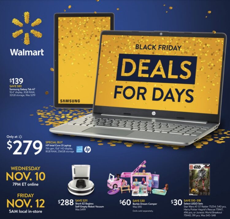 Following the success of the first annual Deals for Days events in 2020, Walmart is continuing the tradition in 2021. The first Deals for Days event focuses on electronics and toys. It starts on Nov. 3 at 7 p.m. ET. Walmart+ members will have early access to deals from 3 p.m. ET to 6 p.m. ET on Nov. 3.